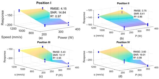 Figure 3 presents the correlations between thermal features and process parameters with regression models, separating the four positions and evaluating the RMSE, SNR, and R