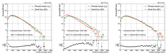 Kinetic energy distribution comparison between the photon fusion and Drell–Yan processes for spin 0 (left), spin ½ (middle), and spin 1 (right) monopoles. Here, -dependent coupling has been used. For the PDFs, NNPDF23 was used for the Drell–Yan process and LUXqed was used for the photon fusion process [10].