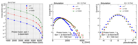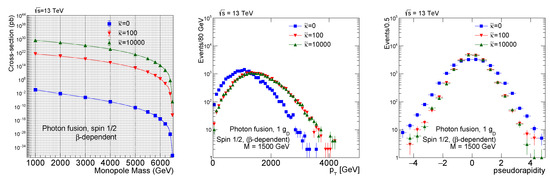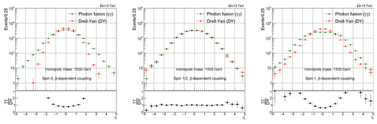 Pseudorapidity () distribution comparison between the photon fusion and Drell–Yan processes for spin 0 (left), spin ½ (middle), and spin 1 (right) monopoles. Here, -dependent coupling has been used. For the PDFs, NNPDF23 was used for the Drell–Yan process and LUXqed was used for the photon fusion process [10].
