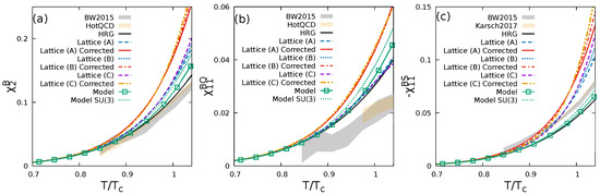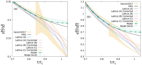 Figure 3, however, the individual susceptibilities cannot be reproduced by the in-medium HRG. The coincidence comes from the strong mass reduction in the charge asymmetric states. The chiral approach leads to the opposite trend that the ratio is above the standard HRG, due to the much milder mass-reduction in the hyperon sector. Therefore, we conclude that the lattice data cannot be explained solely by the mass reduction of the negative-parity baryons.