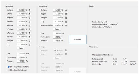 A blended stream was then defined using flow rates of 400 m3/h for NG and 25 m3/h for bio-CH4, under identical thermodynamic conditions (273.15 K and 101.325 kPa). The tool was subsequently used to calculate relative density, HHV, and Wobbe index for the pure gases and the resulting mixture.