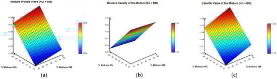 Thermodynamic properties of NG–BM mixtures as functions of CH4 concentration in both gas streams under standard conditions (273.15 K and 1 atm): (a) Mixture Wobbe Index; (b) Relative Density of the Mixture; (c) Calorific Value of the Mixture.
