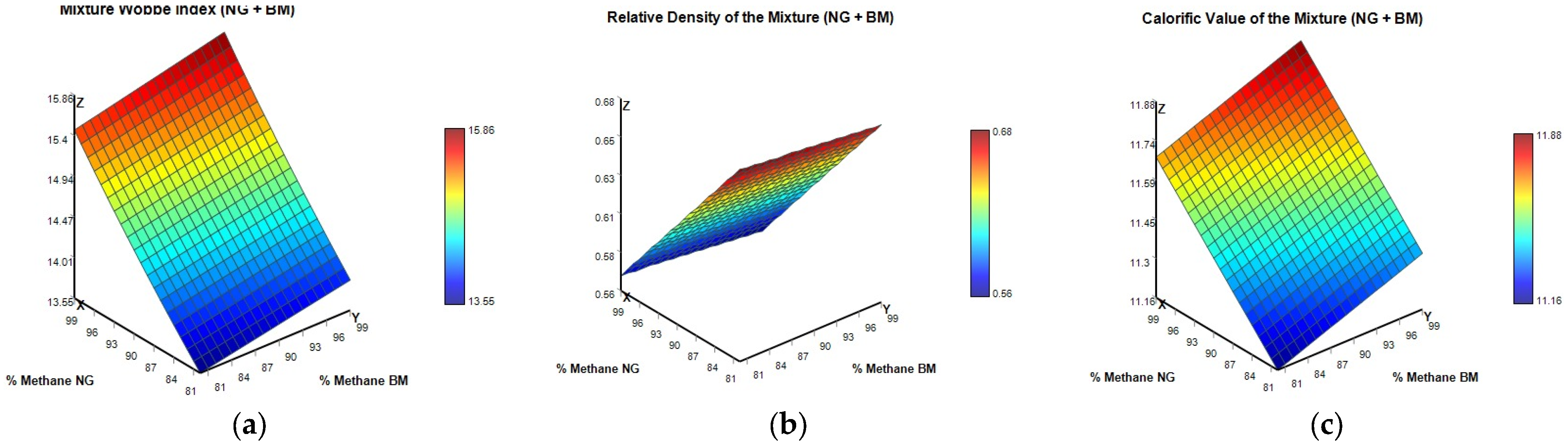 The three surface plots presented illustrate how the Wobbe index, relative density, and higher calorific value of the NG and bio-CH