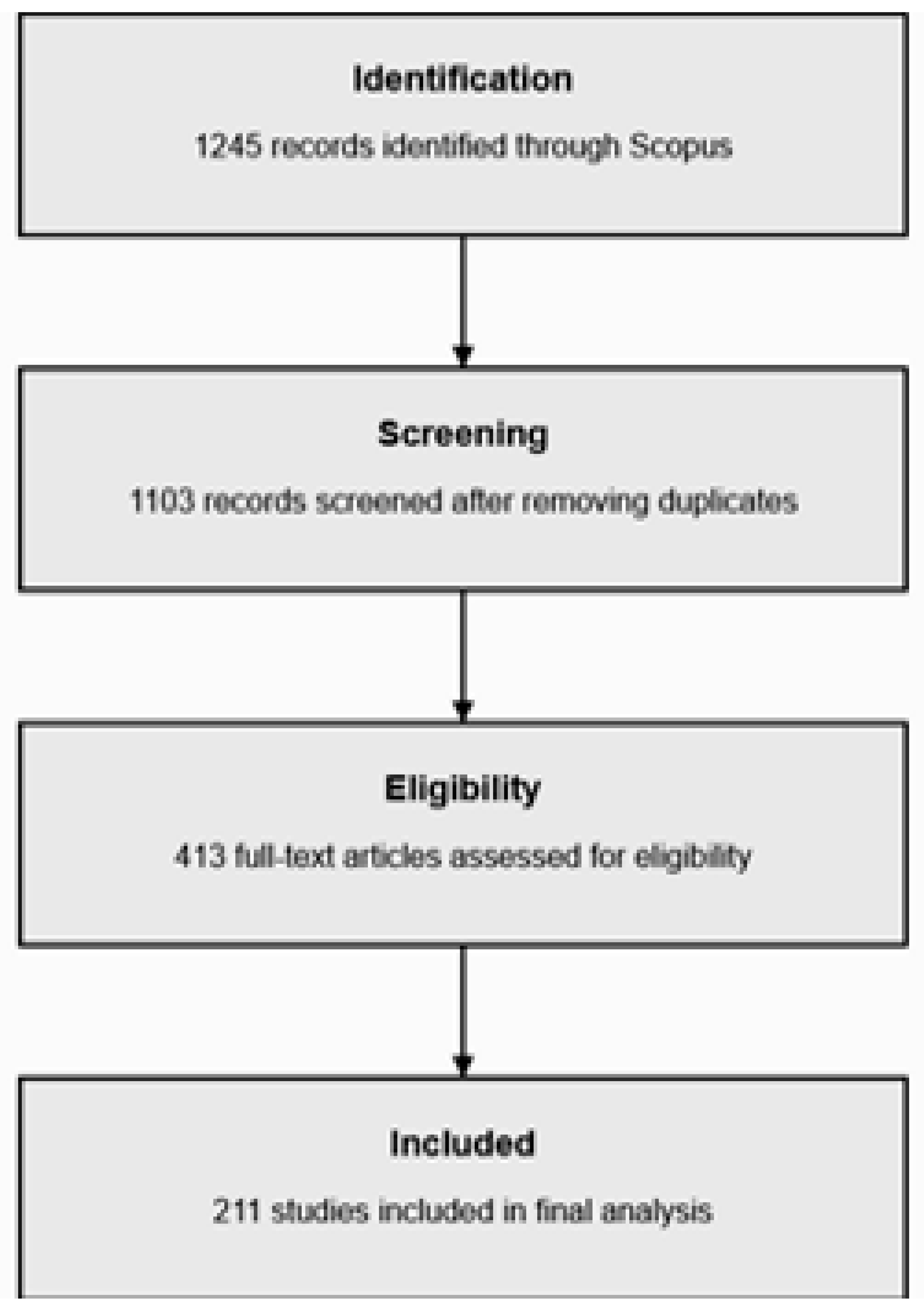 Inclusion: In-depth review of 413 studies and final selection of 211 publications for analysis.