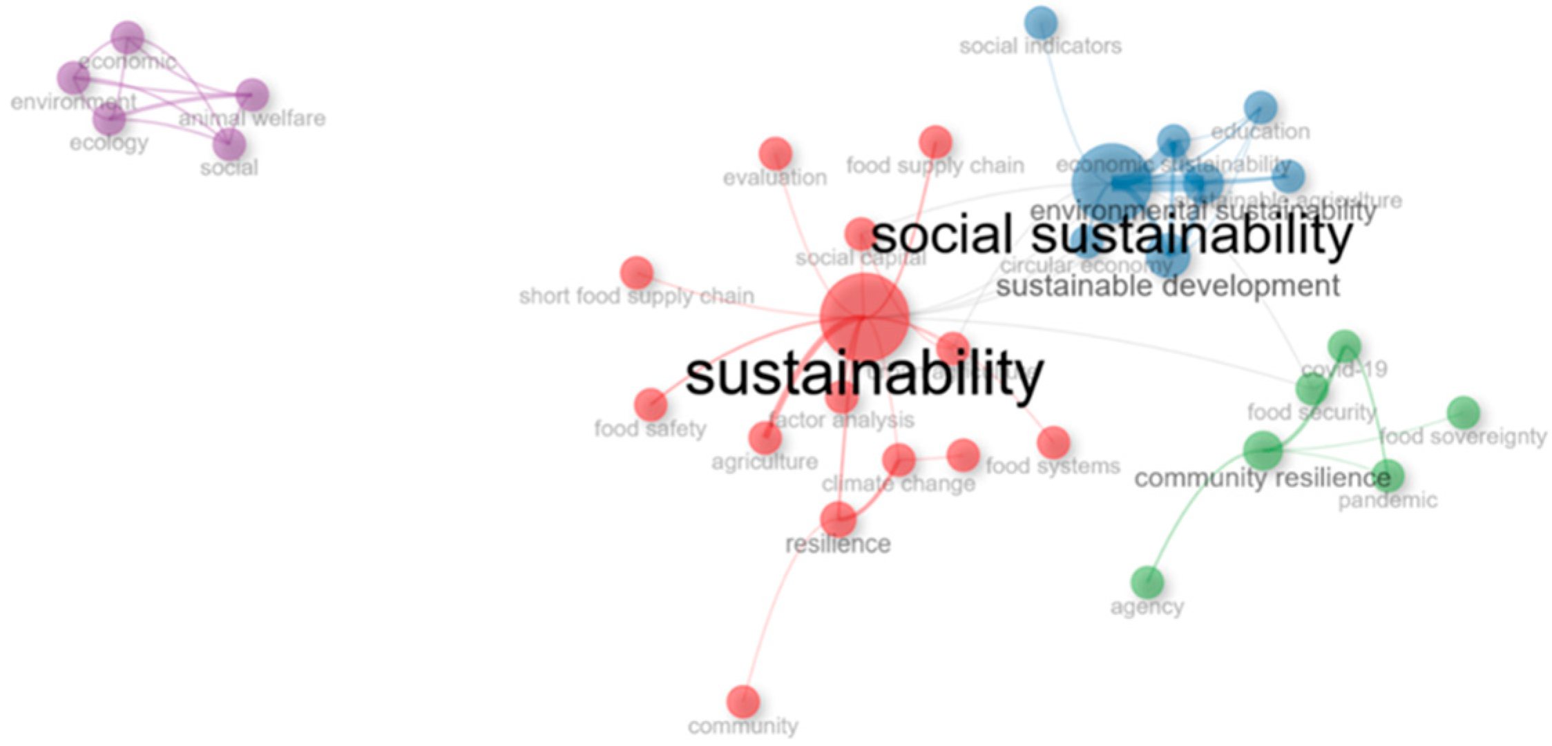 The bibliometric mapping revealed a scientific field that is fragmented and unevenly distributed in terms of thematic and geographical dimensions. The main conceptual clusters identified revolve primarily around concepts such as food security, consumer behavior, and policy governance. However, the analysis showed that important social parameters—such as labor rights, gender, ethnic identity, and migration—remain underrepresented in existing studies [