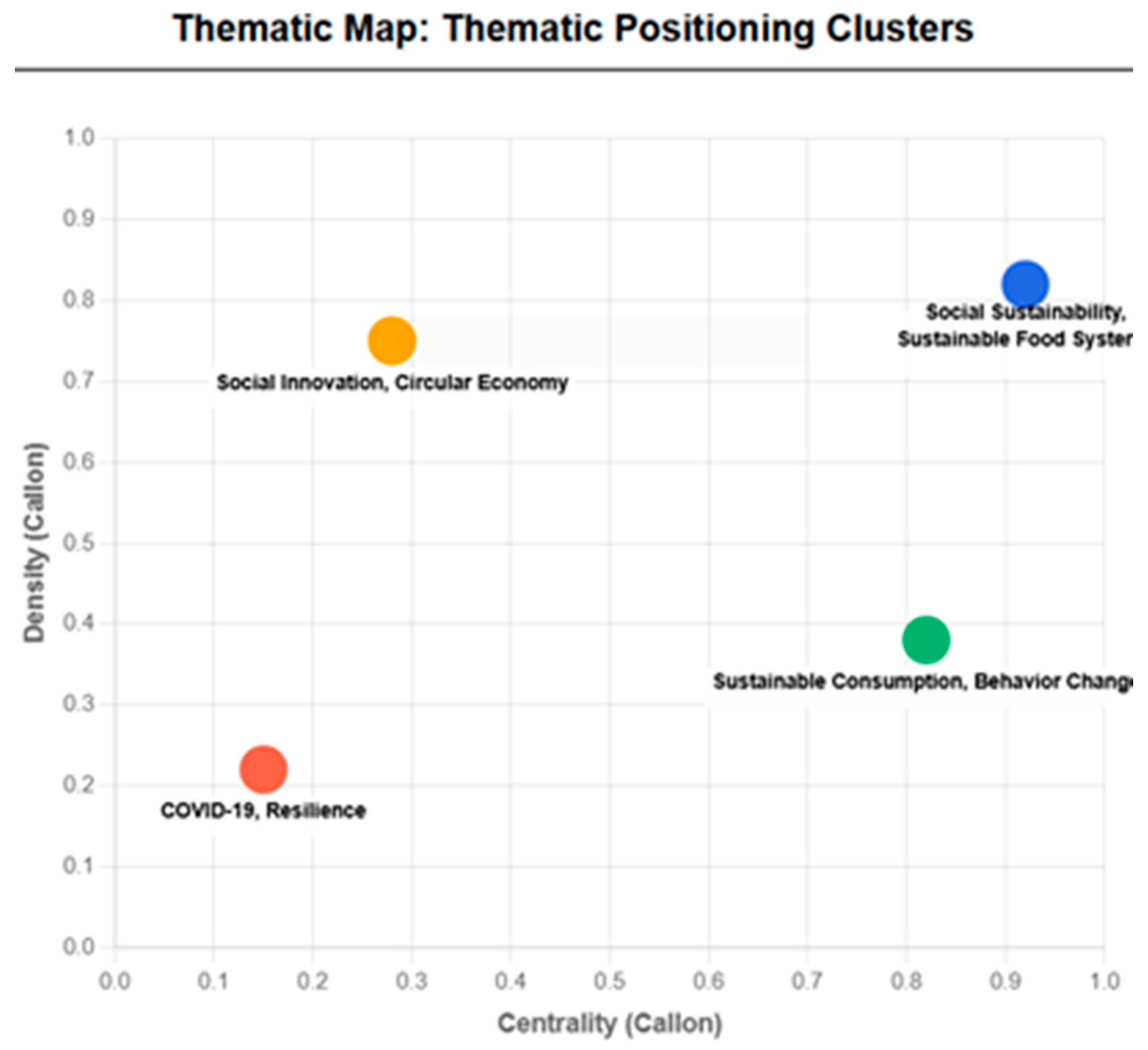 Moreover, the visual representation of the thematic structure is produced through the thematic map, which is based on the axes of density (Callon Density) and centrality (Callon Centrality). Each cluster represents a group of terms that co-occur in scientific publications. Specifically, the position and size of the clusters highlight the significance and maturity of each thematic area, enabling the identification of both well-established and emerging topics in the field of social sustainability and sustainable food consumption.