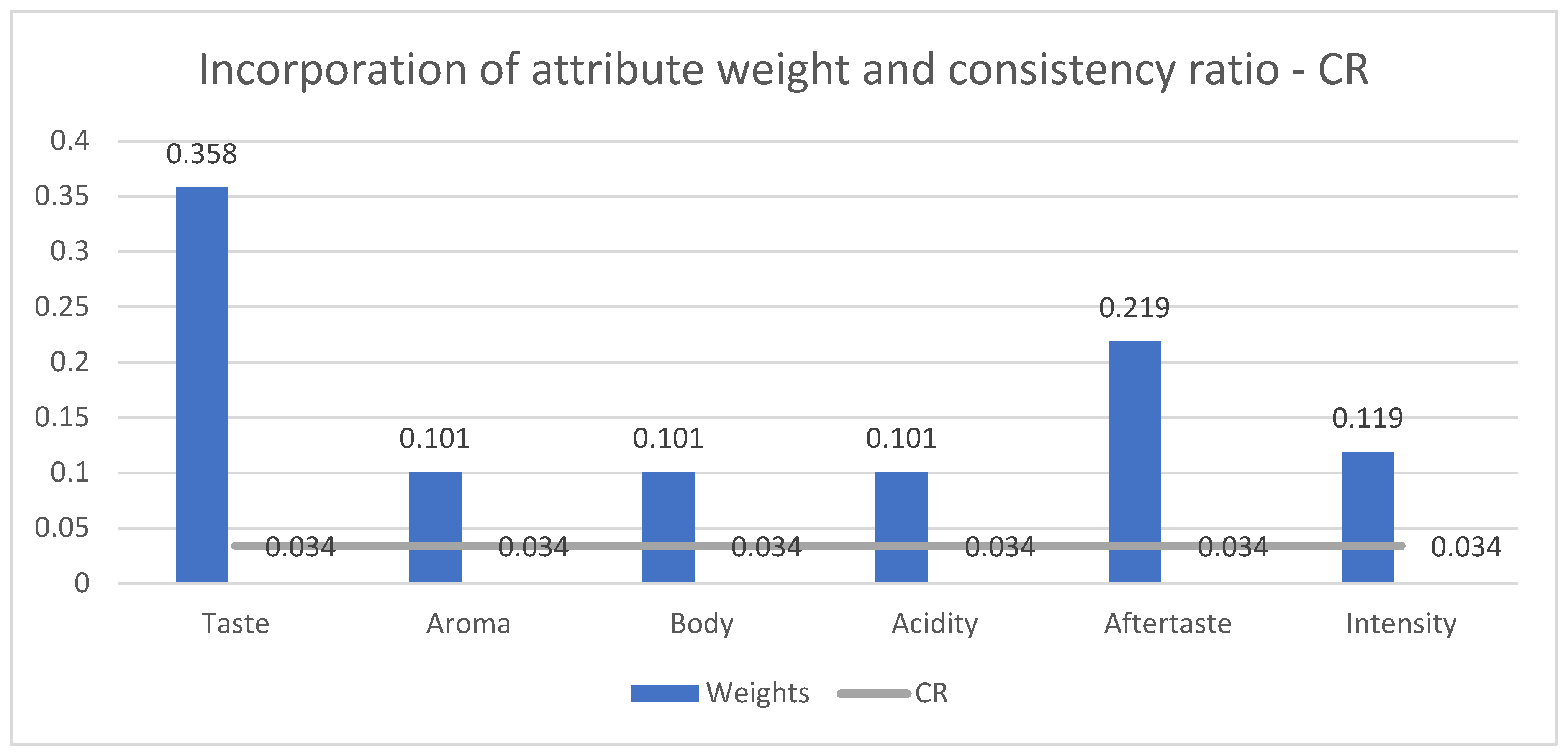 The AHP analysis produced a similar but not identical ranking of attributes, as also presented in Table 3. Again, taste received the highest weight (approximately 40–45%), confirming its dominance across methods. However, in contrast to BWS, aroma received a relatively higher weight (≈18%), suggesting that when respondents evaluate attributes in pairwise comparisons, aroma gains greater significance. Aftertaste and body were assigned lower weights, while acidity and intensity were consistently the least valued. Importantly, most respondents’ matrices achieved a CR below 0.1, indicating reliable pairwise judgment [6].