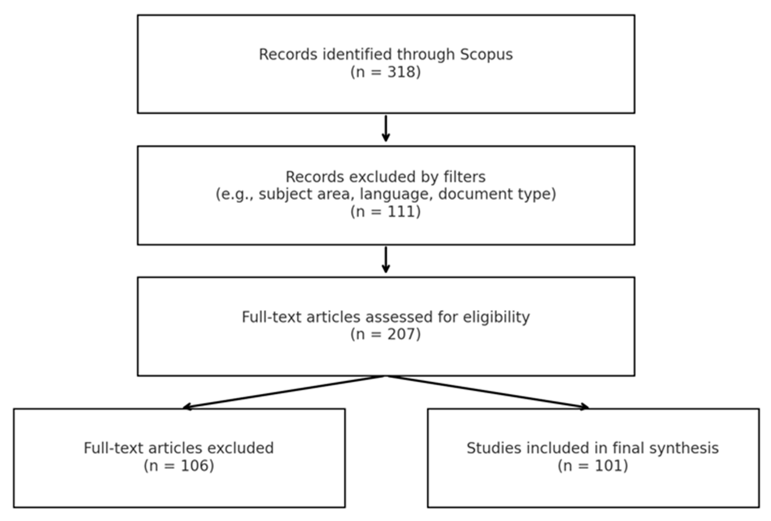 Figure 1. The review focused on peer-reviewed literature sourced from the Scopus database, published between 2005 and 2025. The search strategy combined specific keywords and Boolean operators to capture relevant studies addressing policy implications related to Crop Wild Relatives (CWRs) and crop genetic diversity. Initial search results were screened based on predefined inclusion and exclusion criteria, which focused specifically on the policy relevance of CWR conservation and use. Relevant articles were subsequently reviewed in full text. Data from selected studies were extracted using a structured template designed to capture information on geographic focus, policy frameworks discussed, policy instruments identified, thematic dimensions addressed (environmental, economic, societal), and specific policy challenges highlighted.