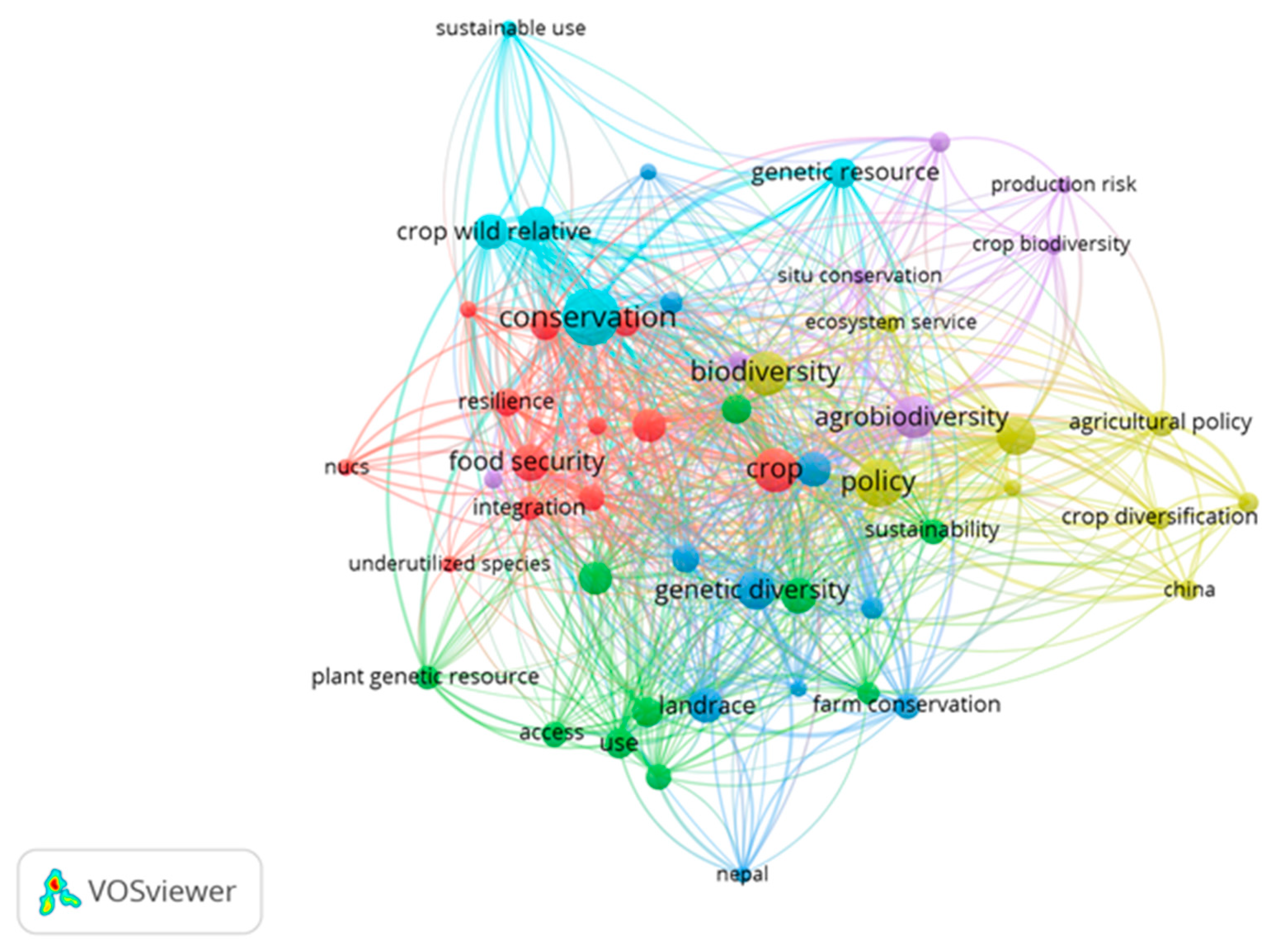 7]. The analysis was based on the co-occurrence of terms within abstracts and keywords, resulting in a focused network of 53 high-frequency terms, extracted using a minimum occurrence threshold of 5. The resulting network visualization co-occurrence map revealed six distinct thematic clusters, each representing a key dimension in the academic discourse on CWRs, agrobiodiversity, and related policy implications (