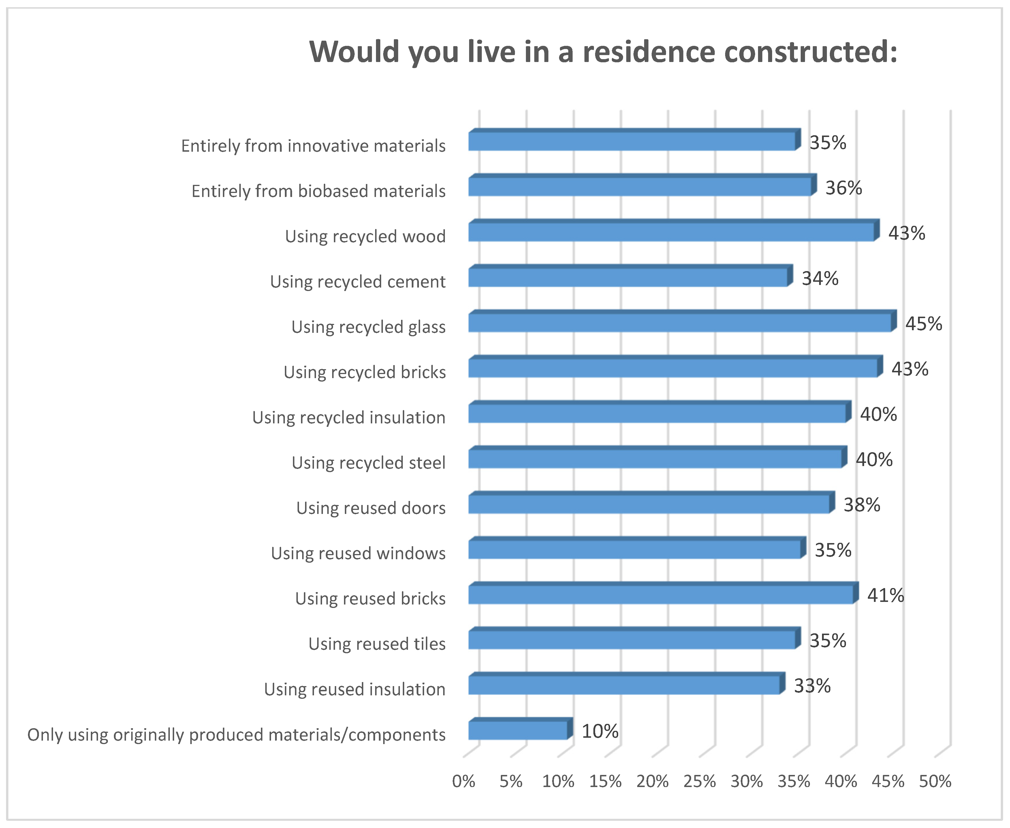 Survey participants were asked several questions to reveal their attitudes towards recycling, reuse and refuse practices in the construction sector. Firstly, they were asked if they would live in a residence constructed from different materials or components. In the overall sample, respondents were more positive about living in a house constructed “using recycled glass” (45%) and “using recycled wood” (43%). On the other hand, they seem to be more skeptical about living in a residence constructed “entirely from biobased materials” (36%) (