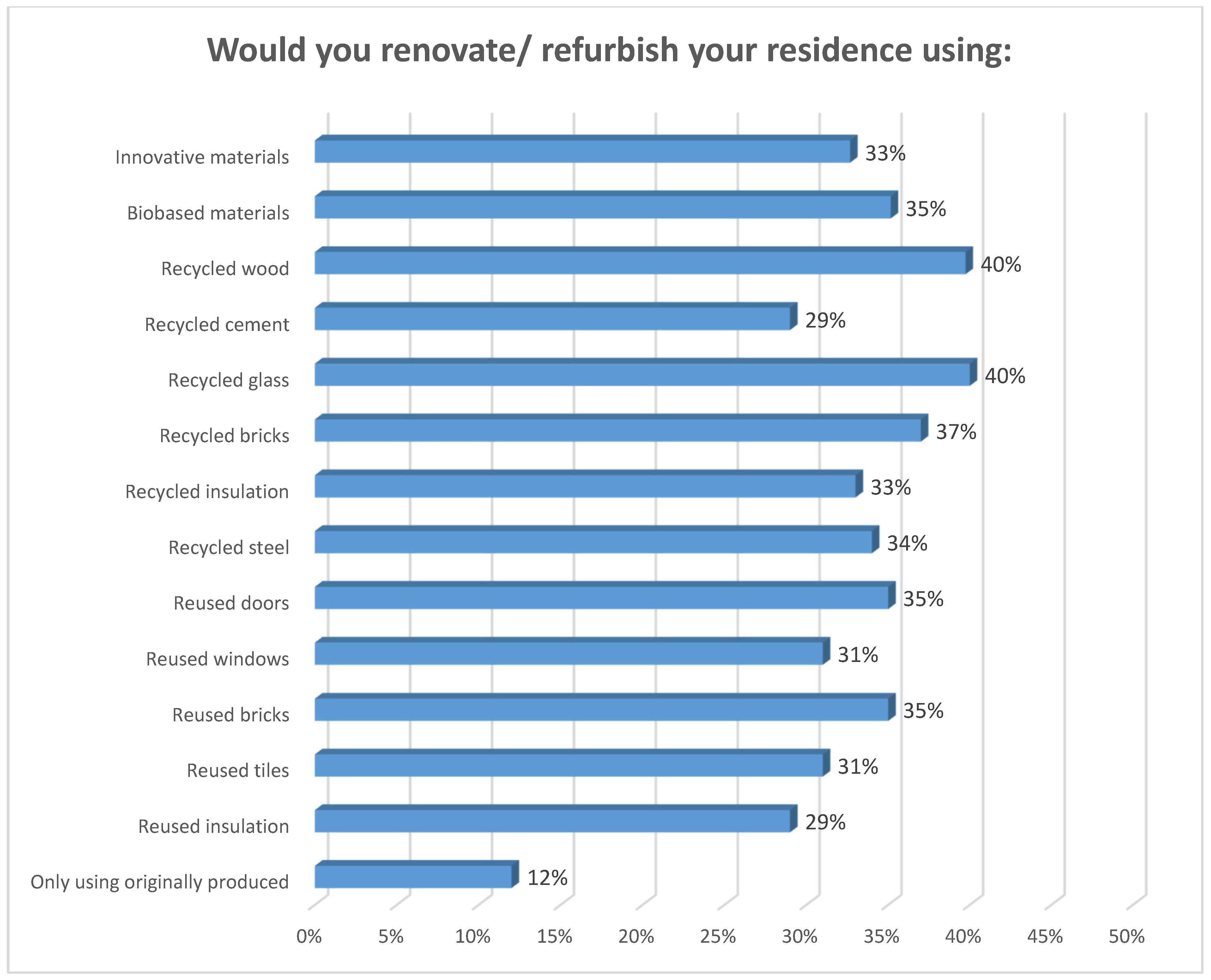 Participants were asked a similar question about the materials or components they would use when renovating their residence. The results of this question are quite similar to those of the previous question. Participants tended to be more willing to use recycled materials (other than recycled cement) than most categories of reused materials/components (except for reused bricks). Overall, the respondents answered more positively about renovating their house constructed using “recycled glass” and “recycled wood” (40% in both cases). On the other hand, they seem to be more skeptical about using “biobased materials” (35%) (