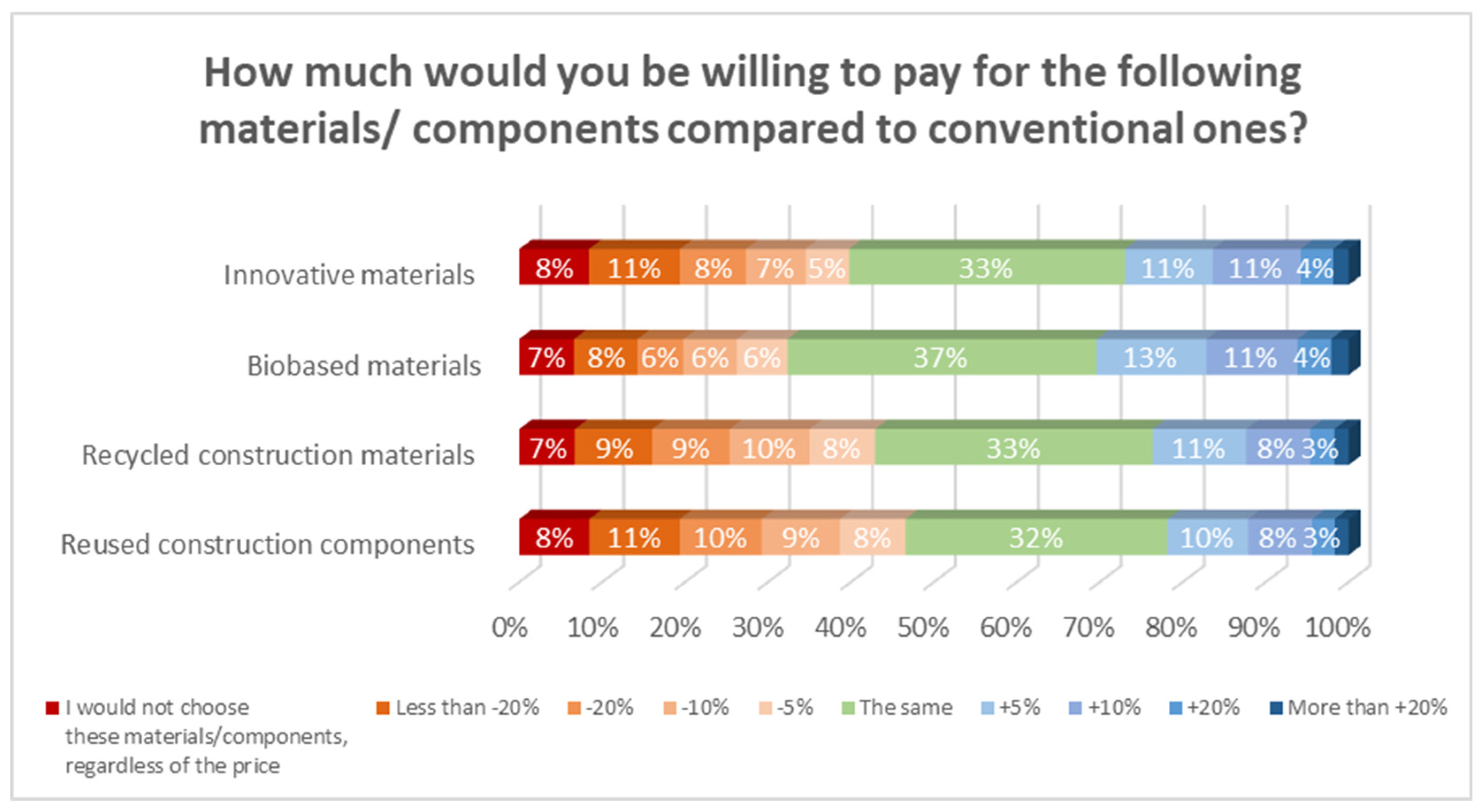 Figure 3, 7–8% of respondents “would not choose these materials/components, regardless of the price”. Additionally, 32–37% would be willing to pay the same price for them as for conventional materials or components. Specifically, for “biobased materials”, 30% of the participants would pay more for them compared to conventional materials, while 26% would pay less. In the case of “innovative materials”, 27% of respondents would pay more for them compared to conventional materials, while 31% would pay less. For “recycled construction materials” and “reused construction components”, the percentage of respondents who would pay less is higher (30% and 38%, respectively).