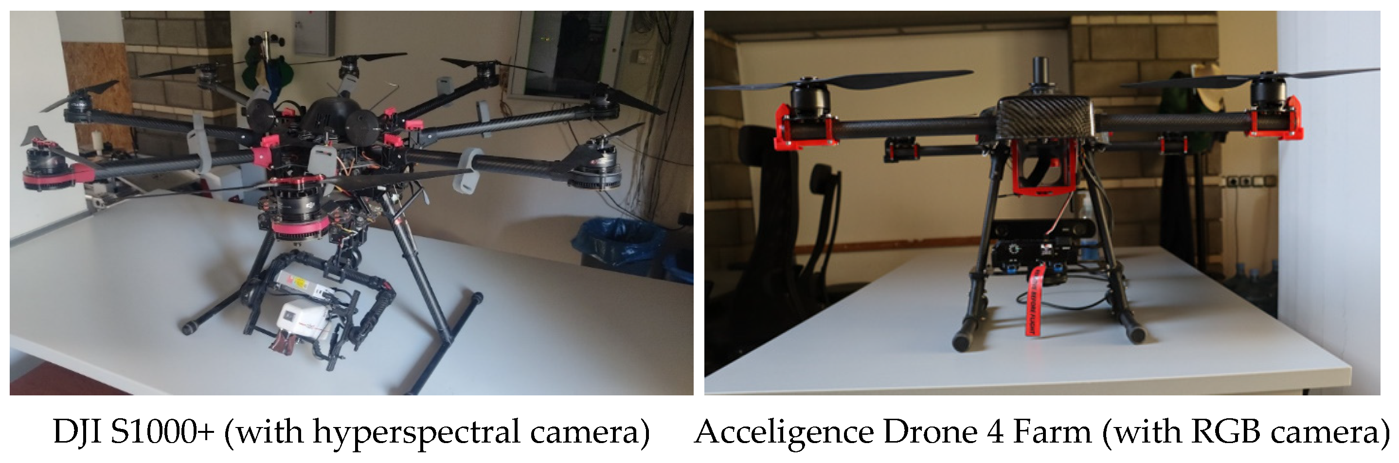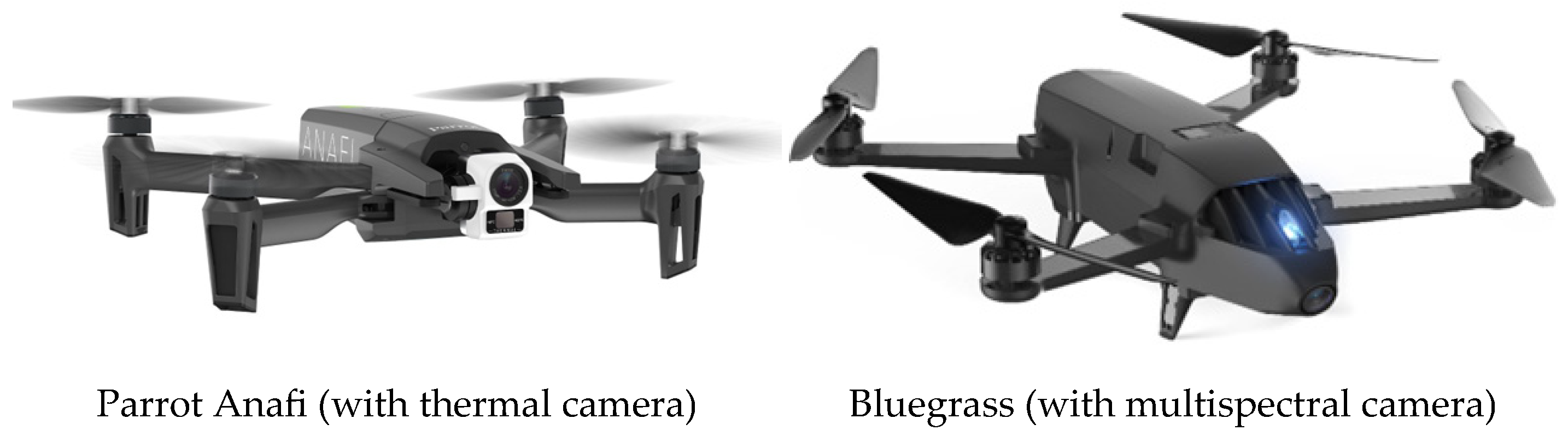 The work took place in a 14-hectare vineyard at the Agricultural University of Athens over a full growing season. The experimental setup involved a coordinated fleet of four UAVs (DJI S1000+ (DJI, Shenzhen, China), Acceligence Drone 4 Farm (Acceligence Ltd., Nicosia, Cyprus), Parrot Anafi Thermal (Parrot, Paris, France), and Bluegrass, (Parrot, Paris, France)) (