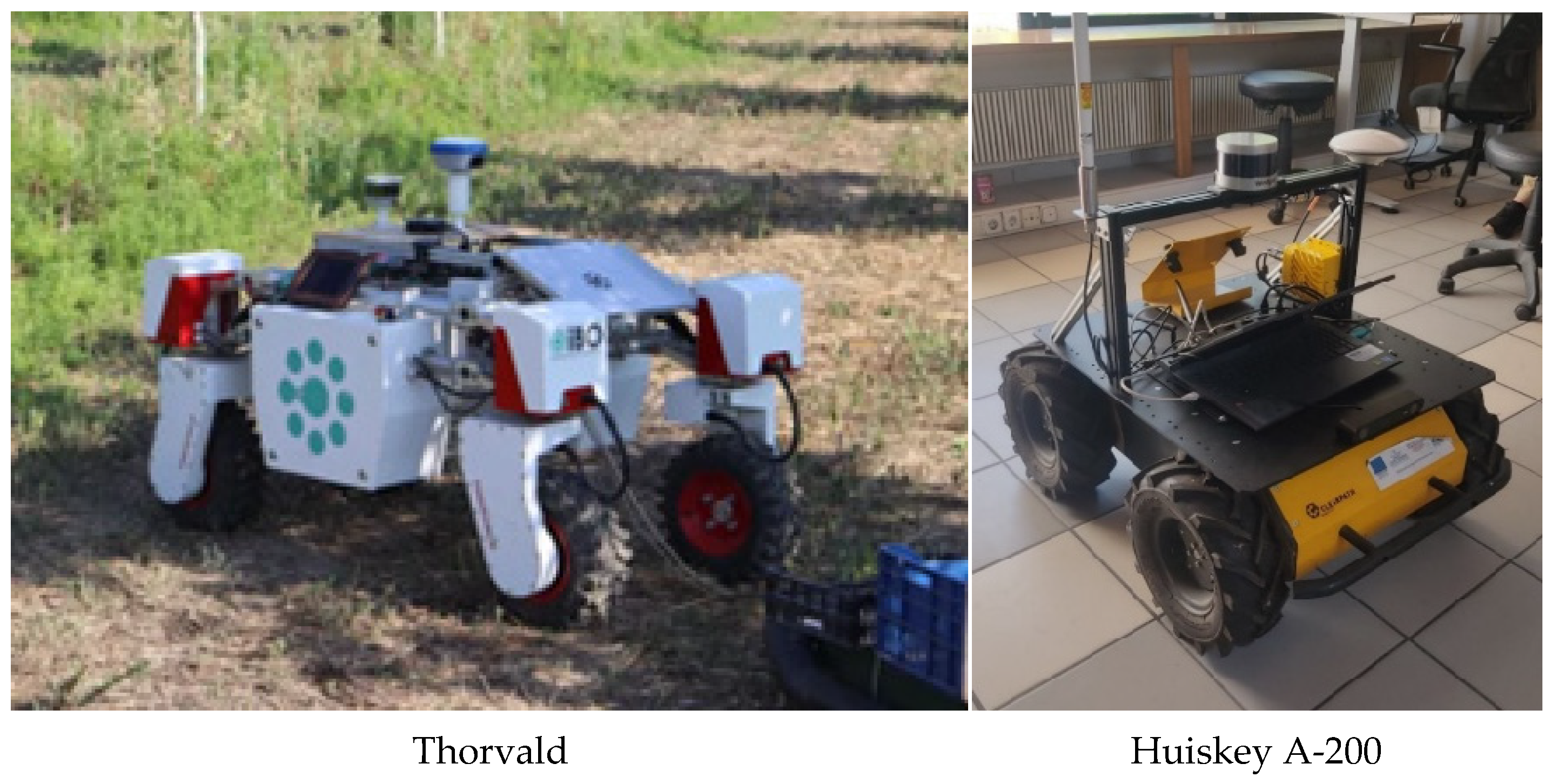 Figure 1) and two UGVs (Thorvald (SAGA Robotics SA, Oslo, Norway) and Husky A-200 (Clearpath Robotics Inc., Kitchener, ON, Canada)), operated autonomously under real field conditions (