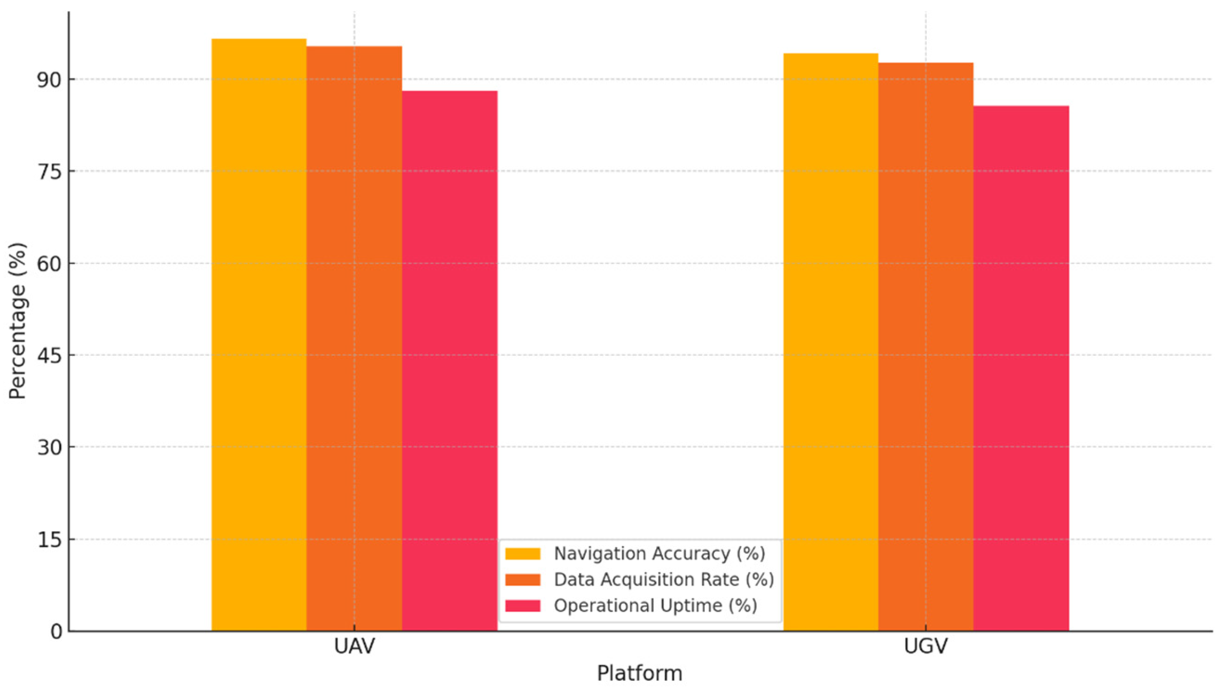 The autonomous fleet completed over 4 UGV and 10 UAV missions across the growing season. Navigation accuracy exceeded 94% overall, with UAVs slightly outperforming UGVs due to unobstructed aerial paths. Data acquisition rates remained consistently above 90% (