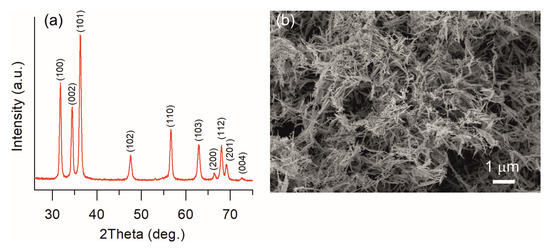(a) XRD pattern of the ZnO nanostructure, (b) SEM images of the ZnO.
