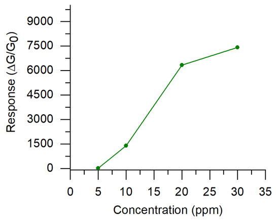 Gas sensing response variation of the ZnO depending on the concentration of H2S (5, 10, 20 and 30 ppm) at 400 °C.