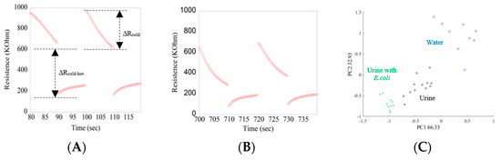 Resistance vs. time curves obtained with the CSS801 sensor. Two cycles of a cold and warm semi-period recorded during the exposition to the VOCs released by urine’s samples (A). Two cycles of a cold and warm semi-period recorded during the exposition to the VOCs released by urine contaminated with E. coli samples (B). A Principal Component Plot of the MOX sensors response to the VOCs released by water (blue circles), urine (black stars) and urine with E.coli (green crosses) (C).
