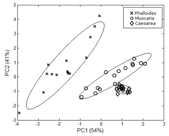 The main objective of the first test is to check the discrimination capability of the developed electronic nose. In this sense, three different types of Amanita mushrooms were used: phalloides, caesarea, and muscaria. Once measured and processed the data, Principal Component Analysis (PCA) was made for dimensionality reduction in order to plot in Figure 1. A high degree of discrimination for each of them is observed, and it can be assured that the system offers different answers for each one of the samples, being similar for mushrooms of the same species. The results obtained with the PCA were confirmed with the classification by means of Artificial Neural Networks with Backpropagation Learning Algorithm, in which 97.7% success was obtained in the cross validation using LeaveOneOut method. Only a mistake in the classification of a Muscaria was obtained, since it was classified as Caesarea.