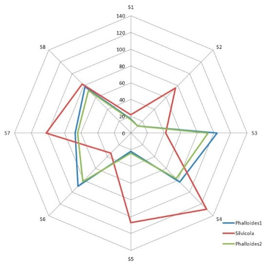 The second test consists of the detection of two species very similar to the sight and that sometimes it is possible to find in nearby locations. These are species of Amanita phalloides and Agaricus silvicola. Once measured and pre-processed data (averaged), Figure 2 graphically represented the response of each sensor, clearly indicated the odorous differences perceived by the e-nose between both mushrooms.