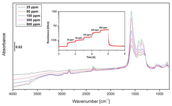 Drifts spectra of LFO sensor exposed to 25, 50, 100, 300 and 500 ppm C2H4 in dry air conditions at 200 °C. All spectra were referenced to the dry air spectrum measured prior to C2H4 exposure. Inset figure shows the DC resistance measurement.