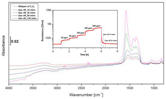 Drifts spectra of LFO sensor exposed to 500 ppm C2H4 in dry air followed by clean dry air for 15, 30, 60 and 120 min at 200 °C. All spectra were referenced to the dry air spectrum measured prior to C2H4 exposure. The inset figure shows the DC resistance.