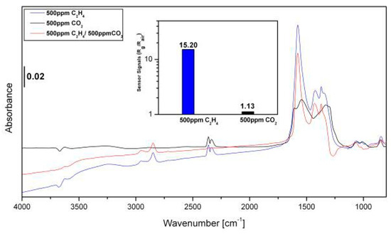 Drifts spectra of LFO sensor exposed to 500 ppm C2H4 (blue line) and CO2 (black line) in dry conditions at 200 °C. All spectra were referenced to the dry air spectrum measured prior to C2H4 exposure, except for the C2H4 spectrum (red line) which was referenced to CO2. The inset figure shows the sensor signals of C2H4 and CO2 in same conditions.