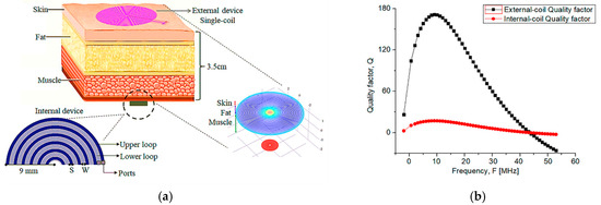 (a) Scheme showing the inductive coupling across the biological tissue and (b) quality factor over a wide frequency range for both designed inductive modules.