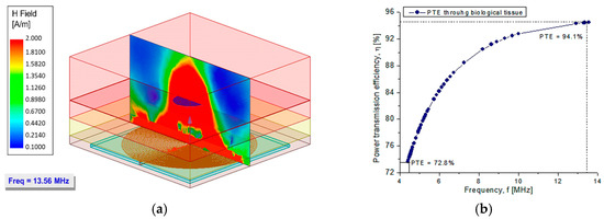 Figure 2a shows the magnetic flux density for this IPT system, considering a 10 cm2 area and a 3.5 cm radiation distance and Figure 2b shows the transmission efficiency as a function of operation frequency; we observe that for the worst case, when , the system shows a field with an intensity sufficiently high for an effective transmission of energy to the implanted coil.