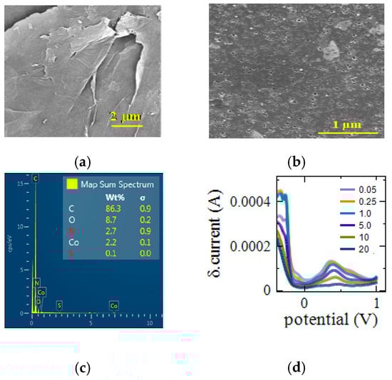Electronic images of the prepared GO and the Co-rGO/PC sensor were acquired using a Field Emission Scanning Electron Microscopy (FE-SEM) and are presented in Figure 1a,b. SEM image corresponding to GO (Figure 1a) showed the presence of few thin layers in the material, confirming the GO formation. Figure 1b showed a porous and smooth uniform surface of Co-rGO/PC. EDS data measured for the Co-rGO/PC confirmed the presence of Co in the sensor and N-doping (Figure 1c).