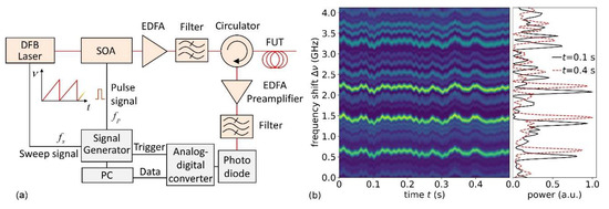 (a) Schematic of the WS-COTDR setup (EDFA – Erbium-doped fiber amplifier). (b) Measured raw data sweep results (Rayleigh backscattering power) for a single distance sample z = 72.8 m, from measurement shown in Figure 2a. (fs = 1 kHz, fp = 200 kHz, 1 m spatial resolution).