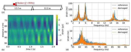 Figure 2c,d show the frequency domain comparison (mean of all sampling positions) of two measurements: before and after an induced damage of the structure (release of pretension). Changes in stiffness are visible in the frequency domain comparison. The high strain resolution and spatially resolved deformation measurement comprises valuable information for more advanced approaches for damage assessment and remaining lifetime predictions.