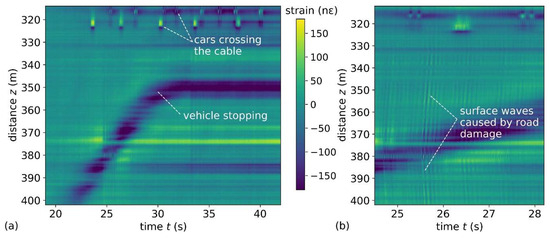 Not all the fibers in telecom cables are used for data transmission. These “dark fibers” can be readily used as sensors for the measurement of ground movement or seismic applications [8,9]. We conduct strain change measurements and use ANNs for strain computation along a 1.3 km long telecom cable buried in a protective duct. The cable runs in parallel to a road and crosses a two-lane road at z ≈ 320 m. Various quasi-static and dynamic events in the nε-range can be seen in Figure 3: a vehicle stopping at 350 m, numerous cars crossing the cable at 320 m, and surface wave propagation due to the vehicle passing a roadway damage at 375 m. These results demonstrate that high-resolution strain measurement along telecom cables can provide a wide range of useful information. High-resolution strain results from a dark fiber grid can, for example, be used for traffic monitoring, hazard detection, and a range of active and passive seismic applications, such as seismic tomography.