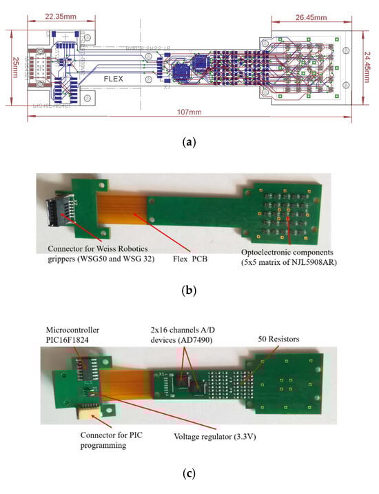 For each taxel, the conditioning electronics is constituted by two resistors: one to drive the LED and a second to transduce the photocurrent measured by the PT into a voltage compatible with the Analog-to-Digital (A/D) converters. Two 12-bit A/D converters (manufactured by Analog Devices, with part number AD7490) with 16 channels and a Serial Peripheral Interface (SPI), has been integrated in the PCB design. for the conversion of the 25 taxel signals. In order to integrate the tactile sensor in a standard parallel gripper, for this work, a microcontroller-based section has been integrated into the PCB design. In particular, an interfacing section constituted by the microcontroller PIC16F1824, manufactured by Microchip Technology, has been added on a separate rigid board, connected to the previous described part via a flexible section. The integration of the microcontroller allows to obtain a fully integrated sensor with a programmable device used to interrogate the sensor via a standard serial interface already available in most commercial grippers. The board is completed by a standard low-noise voltage regulator with an input voltage range up to 12V (typical range of supply voltage available on commercial grippers) and an output voltage equal to 3:3V to supply the whole PCB. Figure 2 reports the layout and some pictures of the whole rigid-flex PCB, with the dimensions and the description of all components. In the realized prototype, the connector compatible with the sensor port available on the commercial grippers WSG-series, manufactured by Weiss Robotics, has been integrated.