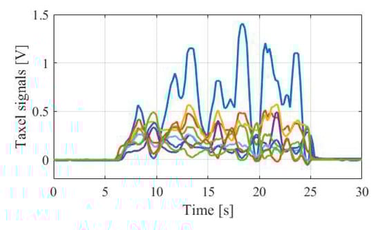 Typical voltage signals acquired from some taxels of the assembled sensor.