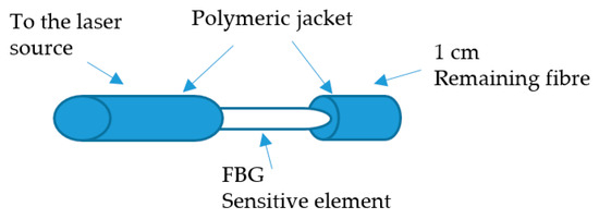 The alginic acid sodium salt from brown algae (sodium alginate) (C6H9NaO7, ≥ 2,000 cP, 2 % (25°C) lit.), with no other chemical modifications, was purchased from Sigma Aldrich UK. Different concentration (1.0, 1.5, 2.0, 2.5, and 3.0 w/w%) were prepared by dissolving the right quantity of SA in deionised water. In order to dissolve the SA powder, it has been mixed, using a magnetic stirrer, at room temperature for three hours. The system was then allowed to stand at room temperature for 24 h to remove baubles. The fibre used in this work was a photosensitive fibre (PS 1250/1500) with the coating diameter of 247.5 μm and the fibre diameter of 125.1μm. The numerical aperture was of 0.12 and operating wavelength of 1550 nm. The fibre was stripped of its polymeric jacket (1.00 ± 0.01 cm) and subjected to a 248 nm KrF laser exposure through a phase-mask to have the periodic perturbation of the refractive index. The FBG was then annealed at 100 °C for 3 hours in order to have its optical properties stabilised.