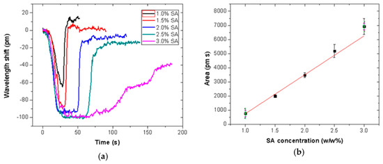 (a) Depiction of the wavelength shift in terms of time as SA w/w% increases; (b) Representation of the increase of area under the peak while the SA w/w% changes.