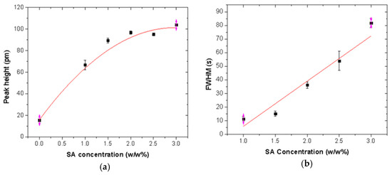 (a) Depiction of the peak height as SA w/w% increases; (b) Representation of the increase of FWHM of the peak while the SA w/w% changes.