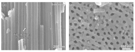 Figure 2. SEM images of a vertically aligned and uniformly shaped TiO2-BaTiO3 nanotubes. (a) Side view and (b) top view of TiO2-BaTiO3 nanotubes.