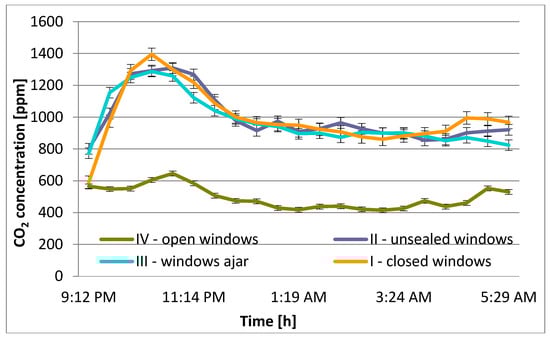 The source of carbon dioxide was only people—two adults. The bedroom had a door that was mounted without a threshold at a height of 2 cm from the floor. The bedroom’s volume was 45 m3. The measurements were carried out continuously from 9:30 P.M. to 5:30 A.M. All measurements were made in four variants: Series I—closed windows; Series II—unsealed windows; Series III—windows ajar; Series IV—open windows.