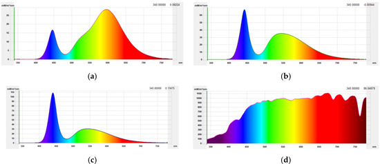 Spectrum emitted by Light Emitting Diode (LED) diodes and the sun: (a) warm white (3200 K); (b) cold white (6500 K); (c) very cold white (8500 K); (d) the sun (in the range of 350 nm to 800 nm).