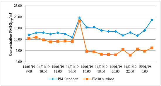 Concentration of PM10 (µg/m3) in an apartment in multifamily building (PM10 indoor) and in outdoor air.