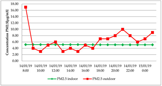 Concentration of PM2.5 (µg/m3) in an apartment in multifamily building (PM2.5 indoor) and in outdoor air.