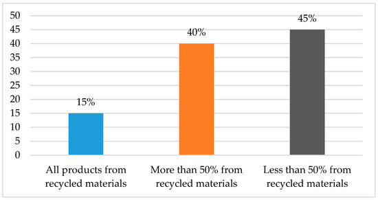 The survey of packaging manufacturers in Lithuania revealed that 60% of those who participated in the survey use recycled raw materials in their production processes. Nevertheless, the percentage varied for various packaging materials. It was 100% for metal and glass packages, as well as for other packages. It must be noted that the group of “other” packages consisted of one single company, producing “eco-friendly textile bags”, as they call them, and therefore is a specific and not representative case. For paper and cardboard packaging, 75% of manufacturers confirmed the use of recycled raw material. Manufacturers of plastic and PET packaging were divided into two separate groups. However, it appeared that there was no difference between PET and other plastics. The share of those who use recycled raw materials made 68% in both cases. In the case of composite packaging, companies using recycled and only primary materials were equally divided: 50% and 50%. Surprisingly, only 25% of wooden packaging produced from the recycled materials. Only a small proportion, 15%, of manufacturers produce their entire production from recycled raw materials. This means that manufacturers of packaging, who replied that they are producing from recycled materials, in fact also have packages produced from primary raw materials only. The proportion of those who produce less than half, and those who produce over half of their production using secondary raw materials, was similar, respectively 45% and 40%. Results are presented in Figure 1.