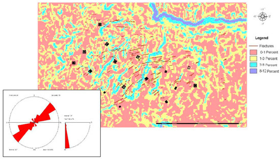Slope plan of the oil field and the distribution and direction of cracks in this area.
