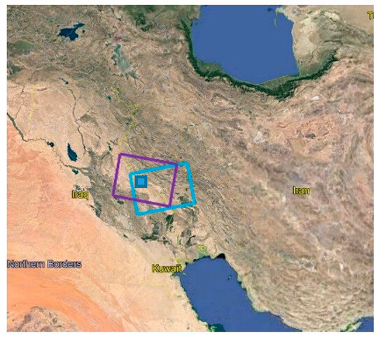 Topography map of Mehran, Ilam. The boxes show satellite trajectories of radar images for descending orbits. The blue box is Azar oil field.