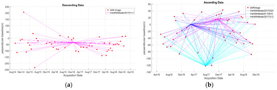 Plots of acquisition dates versus perpendicular baselines for the final network of the (a) Sentinel-1 descending and (b) Sentinel-1 ascending data that were used for the time series analysis. The circles represent synthetic aperture radar (SAR) images, and the lines represent interferograms.