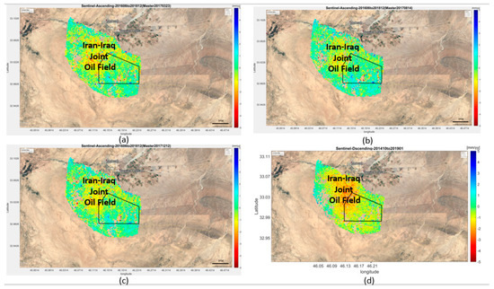 Deformation velocity map with the reference point (46.22, 33.02) for (a) S1 ascending with master 20170323, (b) S1 ascending with master 20170814, (c) S1 ascending with master 20171212, and (d) S1 descending with master 2017011. The polygon is Azar oil field.