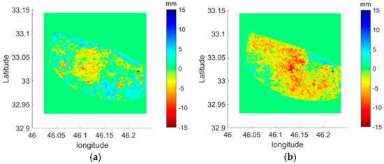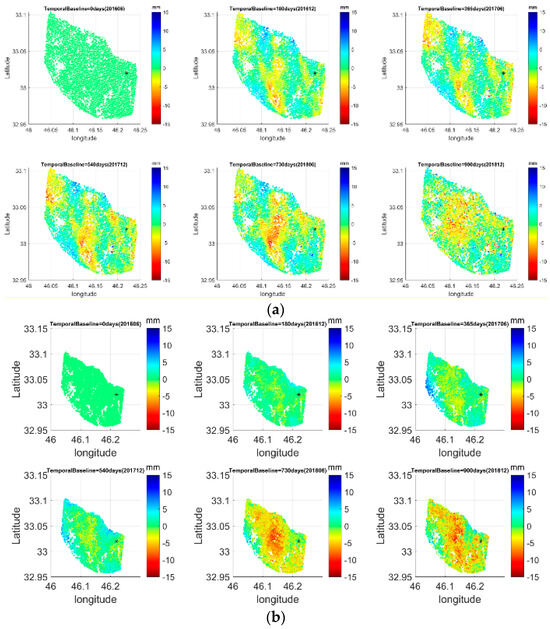 Cumulative displacement of Azar oil field obtained from June 2016 to December 2018 every six months: (a) ascending Sentinel-1 (b) descending Sentinel-1.