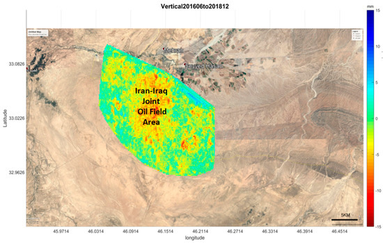 In Figure 9, where the ascending and descending data are the same there has been a vertical displacement (which is the area located over Iran and Iraq’s tank); where there has been a difference in the line of sight direction, displacement has been horizontal. Figure 10 shows vertical displacement after decomposition.